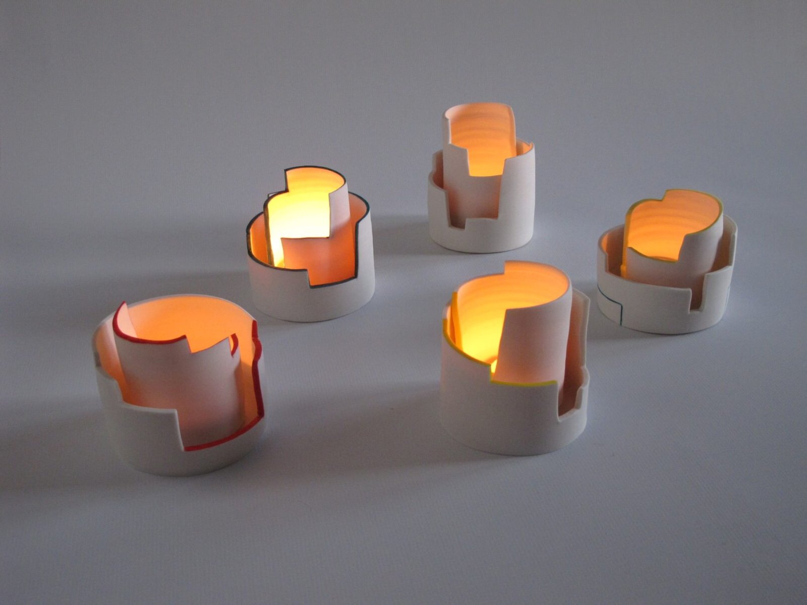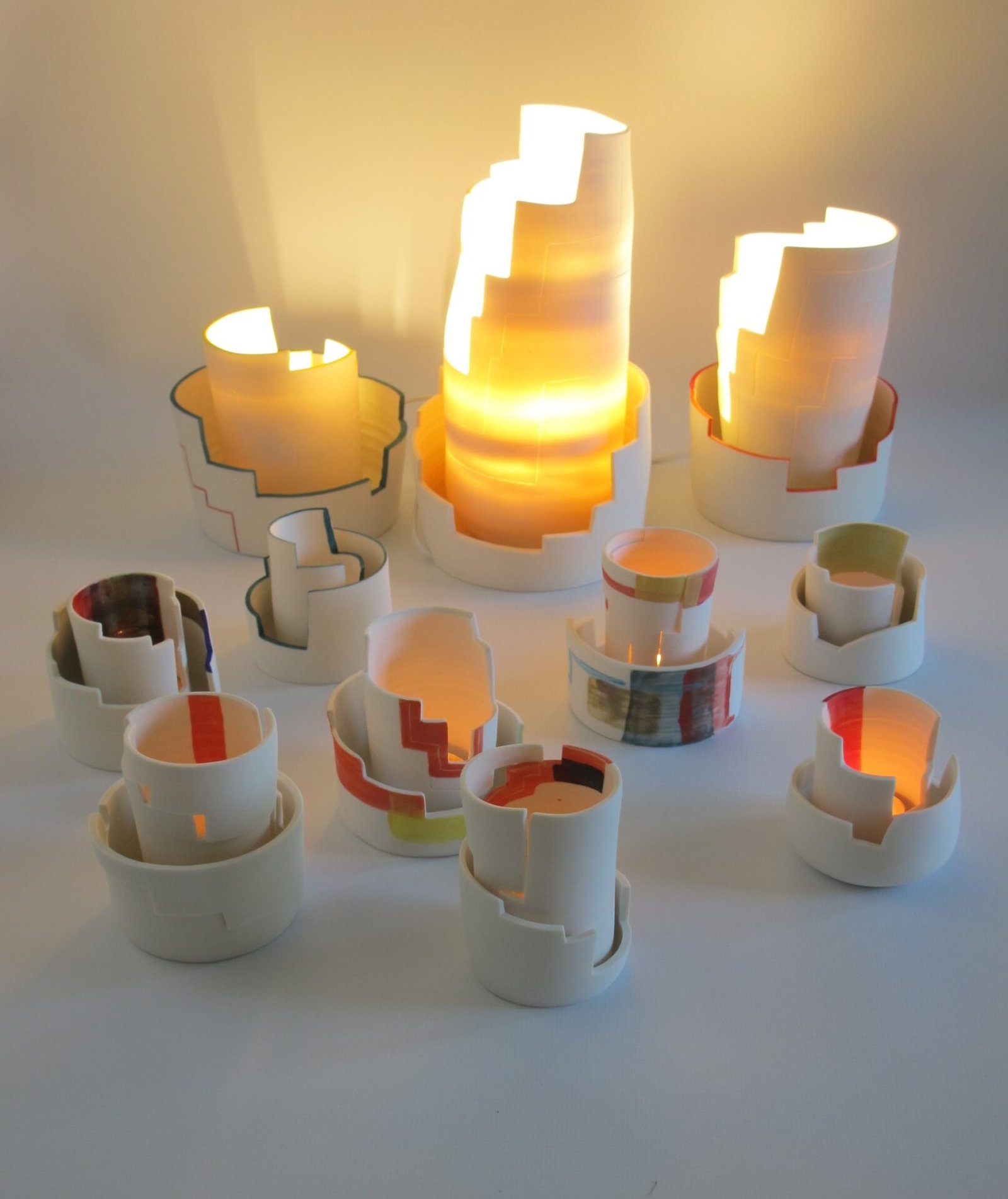 These light objects are musings on the boundaries between inside and outside. Each piece can rotate inside, and create different sculptures and light.